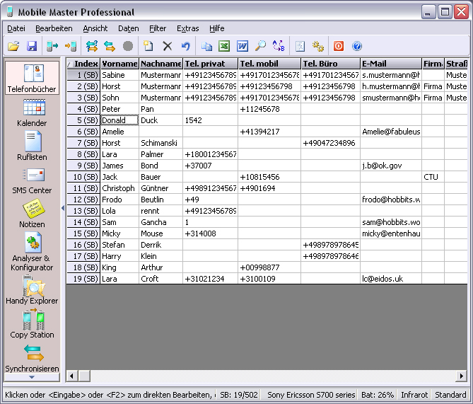 Mit Version 6.0.3 werden neue Modelle der Marke Samsung (z.B. E800), das Gigaset ISDN SX440/445 von Siemens, sowie die neuesten Siemens-Handys bis zum CX70 unterstützt. Ausserdem sorgen neue AddIns für eine vollständige Integration der Mobile Master Funktionen in Outlook und Lotus Notes: Über einen eigenen Menüpunkt können alle Daten direkt aus Outlook heraus synchronisiert werden. Wird ein Kontakt im Adressbuch in Outlook geändert, kann er mit einem Klick im angeschlossenen Handy angepasst werden. Mobile Master erkennt dafür automatisch das passende Profil und synchronisiert dementsprechend die gewünschten Kontaktdaten. Als zusätzliches Schmankerl bietet Mobile Master die Unterstützung für griechische und kyrillische Zeichen an.
