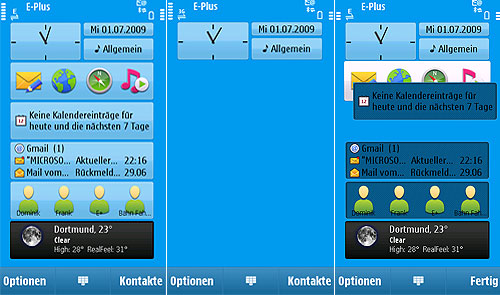 Bei Bedarf lassen sich noch weitere Widgets nachinstallieren. Hierzu steht eine stetig wachsende Anzahl von Widgets über den Ovi-Store zur Verfügung. Übrigens lassen sich maximal 5 Widgets gleichzeitig nutzen, diese lassen sich nach Belieben hin- und herschieben, so wie man die Reihenfolge gerne hätte. Wer mag kann über das Optionsmenü die Widgets auch offline schalten, so werden z.B. das Wetter-Widget oder das E-Mail Widgets nicht mehr automatisch per Internet-Aktualisierung auf den neuesten Stand gebracht. Hierzu reicht es um genau zu sein im Menü den Punkt "Startansicht offline" auszuwählen, bei Bedarf lässt sich dies natürlich problemlos wieder umstellen.