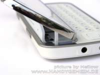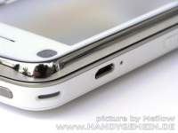 Doch kommen wir jetzt noch im Detail zum Gehäuse und seinen Besonderheiten. Auf der Geräteoberseite befinden sich zwei Dinge: einerseits in der Mitte der 3.5mm Klinke AV-Anschluss und daneben die Ein- / Ausschalttaste. An der linken Gehäuseseite findet sich der microUSB Anschluss sowie die Sperrtaste für das Display und die Tasten. Kaum sichtbar befindet sich am Rand des Akkudeckels jeweils links und rechts ein kleines Lautsprechergitter hinter dem sich die Stereo-Lautsprecher befinden. Auf der rechten Seite des Telefons findet man den Lautstärkeregler und die Taste für die Kamerataste wieder.