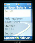 In Sachen Organizer war ich mit den bisherigen Siemens-Handys immer sehr zufrieden. Beim SXG75 kündigte Siemens dann auch auf seiner Webseite in allen Datenblättern und Pressetexten an, das SXG75 werde "einen vollständigen Organizer inklusive Adressverwaltung, Terminplaner, Aufgabenverwaltung und Notizverwaltung" enthalten. Um es vorweg zu nehmen: diese Angaben waren falsch. Die Organizerfunktionen dieses "Business"-Handys aus der Siemens S-Klasse sind auf A-Klasse-Niveau anzusiedeln: